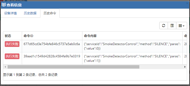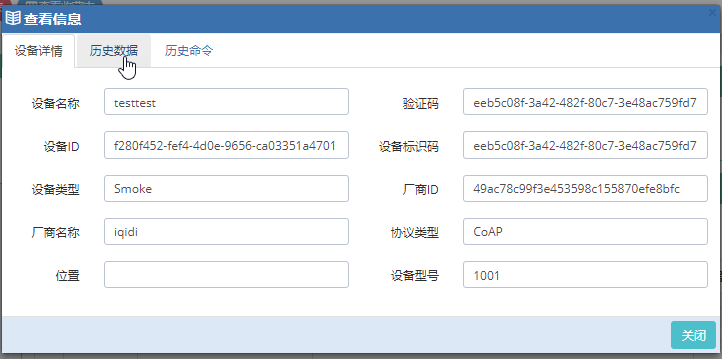 同样,设备详细信息,通过对应ID调用SDK接口获取数据,并返回到视图即可展示出来了。设备的相关信息,如下历史数据、历史命令等,我们也可以通过对应接口进行数据获取返回,在界面的Tab控件进行展示即可。