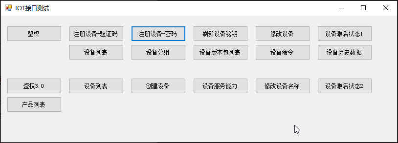 根据IOT的应用侧API的定义,我们编写一个快速测试SDK工作情况的Winform程序来测试,如获取授权信息,以及查询产品、注册设备、修改设备、获取设备状态和详细等等接口的正常与否,然后再在Web应用中进行整合,这样可以减少返工调试的问题。