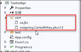 在使用SDK接口前,我们需要知道,华为IOT的API接口,基本上全部需要证书的对接的,这个和我们开发微信API有所差异。例如,我们的Winform测试程序,让它带有一个Cert目录下的证书文件,这个证书文件可以在API的Demo里面找到,或者在华为IOT平台上下载。
