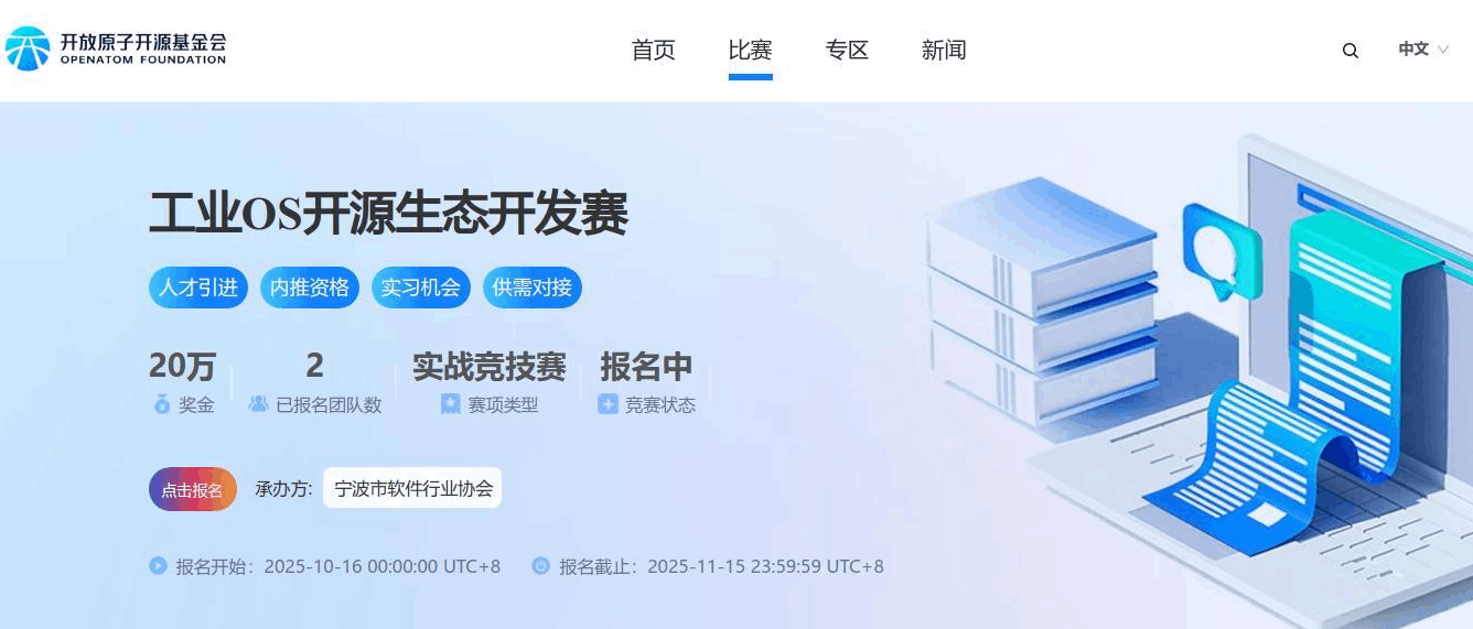 为积极响应国家推动开源生态建设的战略部署,助力宁波市制造业高质量发展,针对当前新型工业化建设过程中面临的软件自主可控、技术成本高昂及创新人才短缺等挑战,工业OS开源生态开发赛已正式开启报名。本次赛事以“开源赋能 智造未来”为主题,聚焦工业场景的开源技术创新与应用实践,诚邀全国开发者、高校团队、科研机构及企业力量共同参与。